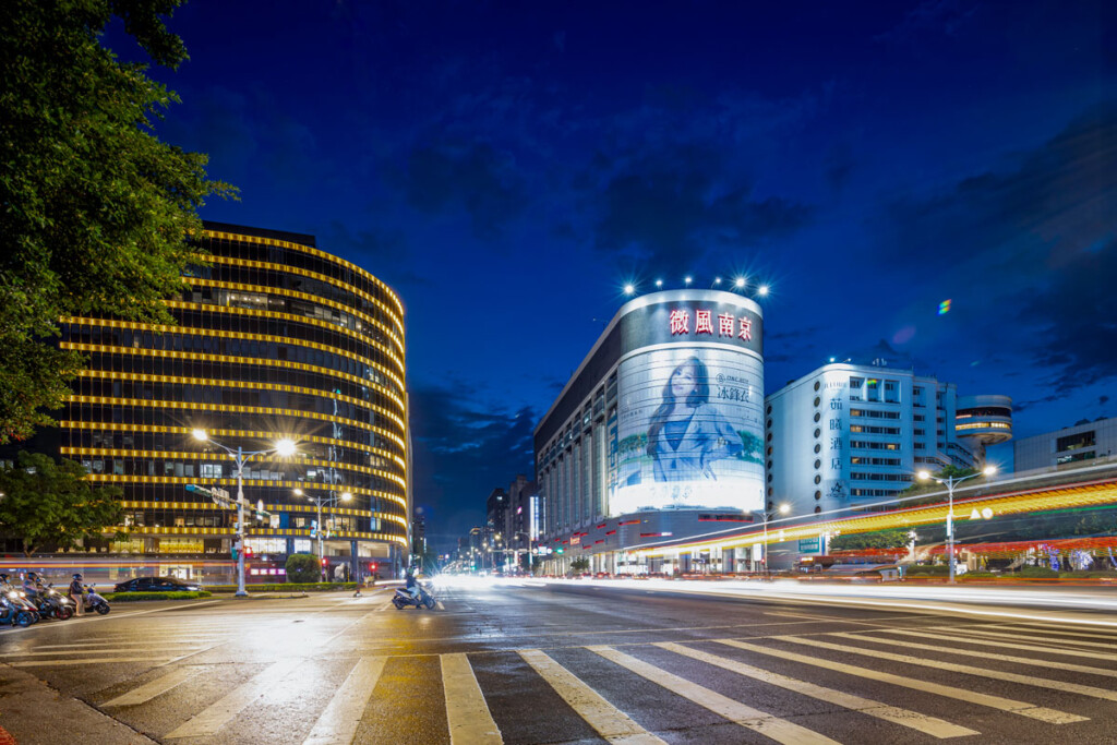 建築由李祖原團隊主導,以簡潔垂直線條結合飛簷語彙,呈現現代與東方融合的美學比例;燈光設計由袁宗南團隊執行,以層次柔光勾勒立面韻律。