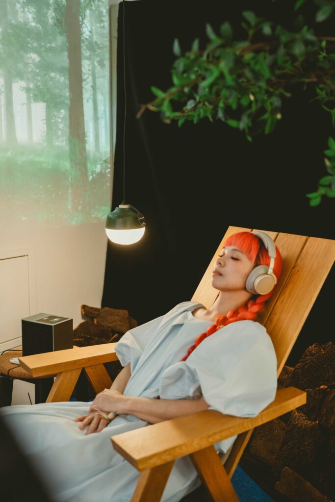 展區內的3張設計單椅,是整場體驗的關鍵主角。許哲珮以創作者與專業催眠師的雙重身份,錄製3段聲音引導,帶領觀者進入「森林的歸屬感」、「宇宙的探索」與「情緒的安放」3種潛意識世界。