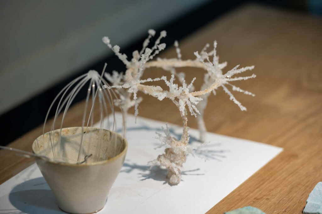 核心作品《能源 Energy》以天然奢石為媒材,轉化地心能量與時間記憶;沉浸式裝置《窺探的場域》則以「月洞門」為意象,結合光影、聲音與氣味,引導觀者體驗石與身體之間的感知共鳴。