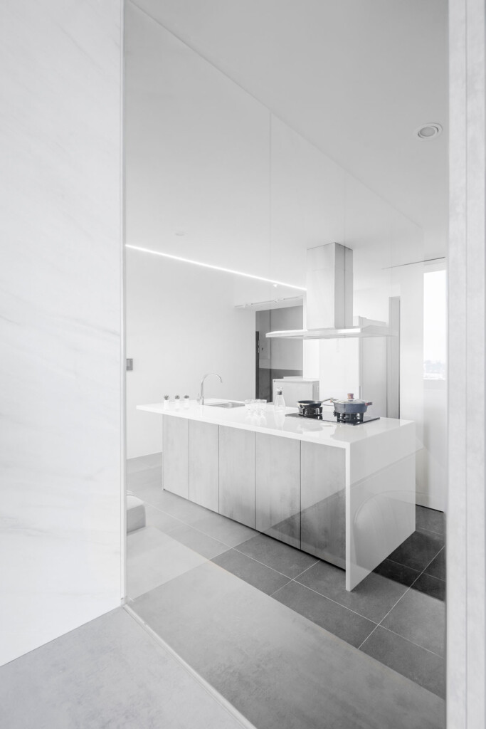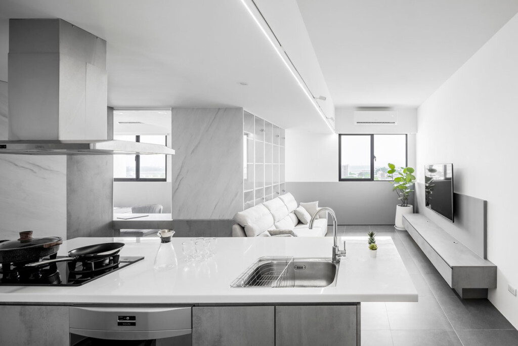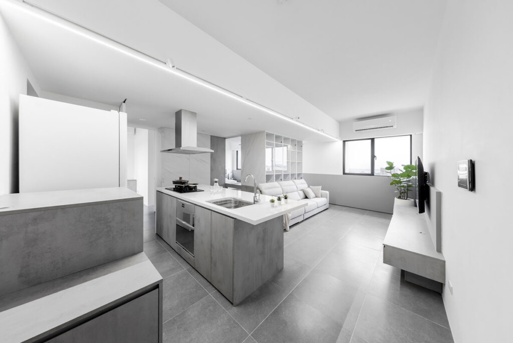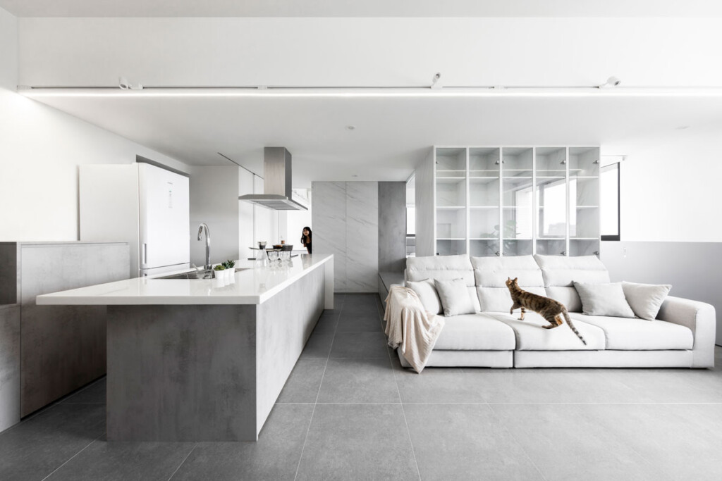 此案中,顏色與材質的選擇也頗具張哲毓個人特色。整體色調以灰白為主,白色營造乾淨明亮的基底,灰色則成為空間結構的「生成點」。