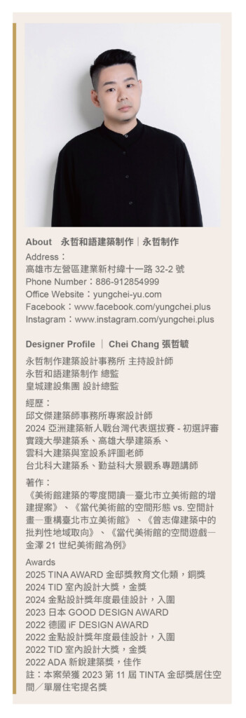 張哲毓並不以「室內設計師」自居,他的專業背景橫跨景觀與建築,並長期參與台灣設計研究院與公部門的公共場域美學改善計畫,如彰化湖東國小(光棚計畫)、台南新化國小(盒樂教室)、高雄大義國中(藝術光廂)、屏東縣霧臺大武衛生室重建以及嘉義縣府會之心景觀再造工程等。他與兩位創業夥伴共同成立的「永哲和語建築制作」,名字宛如一部膠片,一種逐格構築空間敘事的企圖,慢慢找回久違的關係和無形中失去的坪數。
