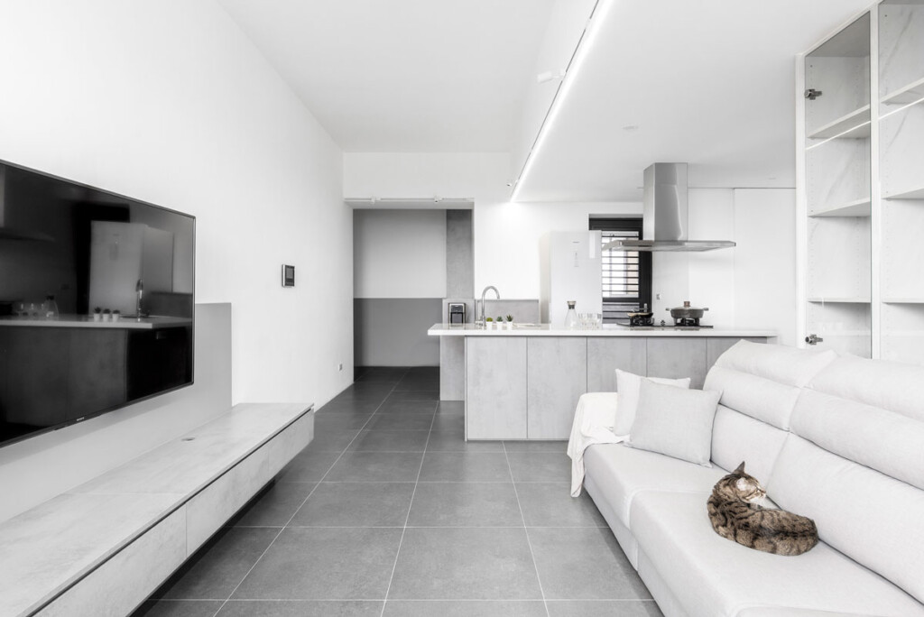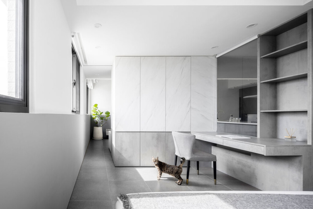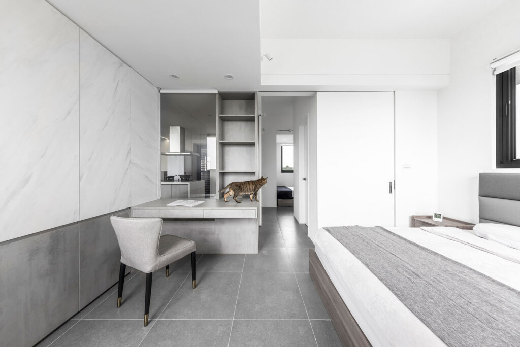 設計上,地磚一路延伸到臥室,打破傳統磁磚僅用於公共區域的慣例;矮櫃與系統櫃也多以灰色肌理為主,與地面連成一氣。