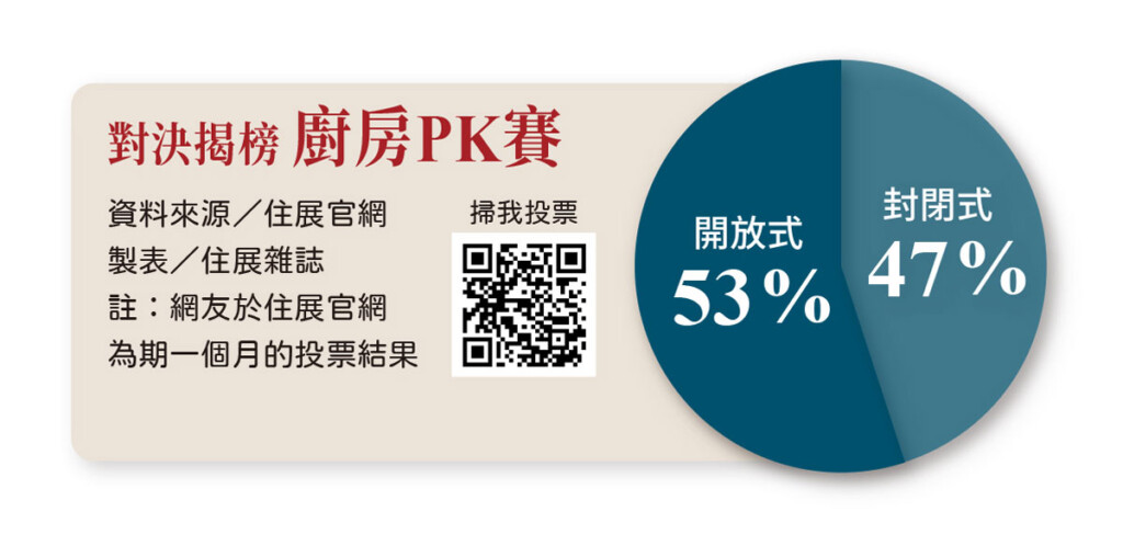 在此次票選中,我們也觀察到一項有趣趨勢:多數支持封閉式廚房的民眾,不一定是重油重炒的「硬派料理族」,而是更在意秩序、收納與日常整潔感;而擁抱開放式者,則偏好整體空間的融合感與家人間的互動陪伴感。