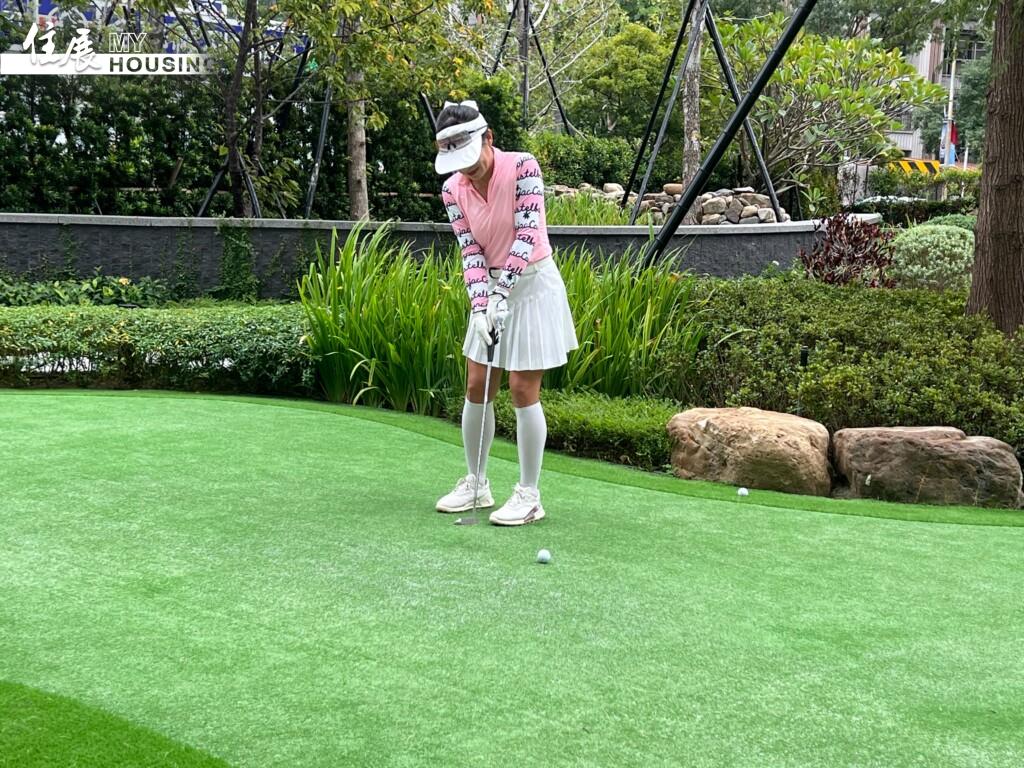 《雙橡園2279》社區花園設置推桿果嶺,讓住戶在綠意中進行休閒運動,展現低密度純住宅的生活氛圍。圖/陳昱均